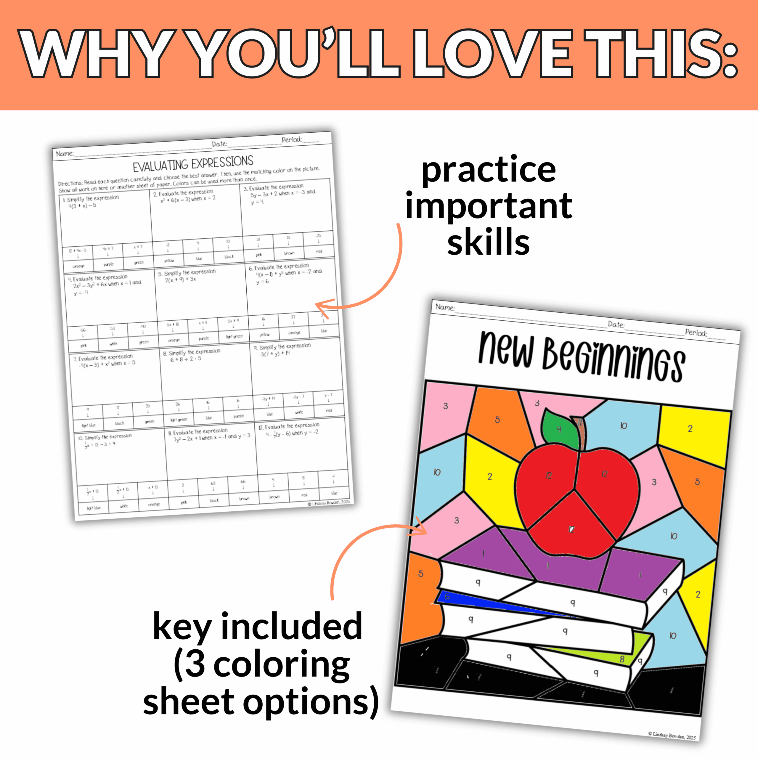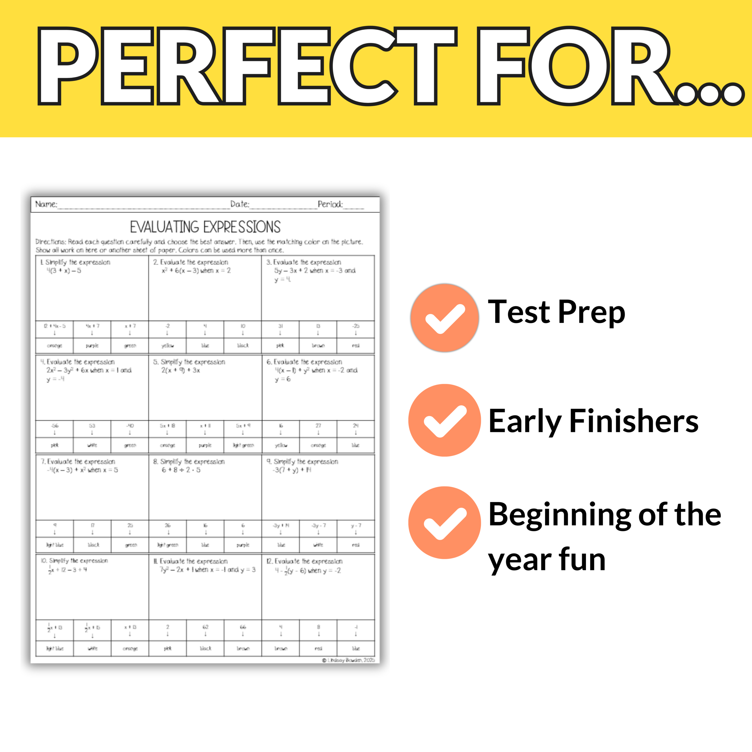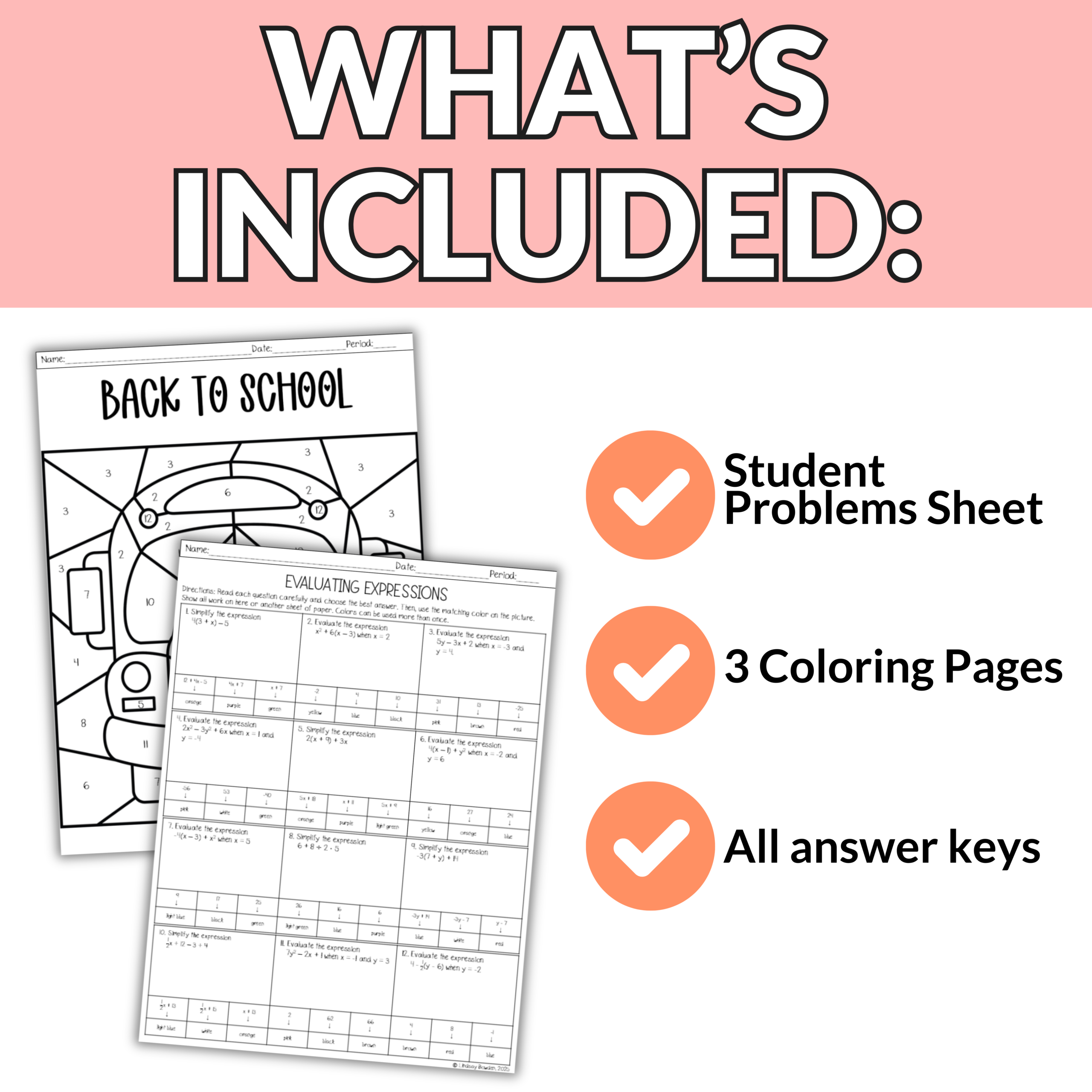 ➡️ Grab this resource today to make simplifying and evaluating expressions have a touch of back to school fun.