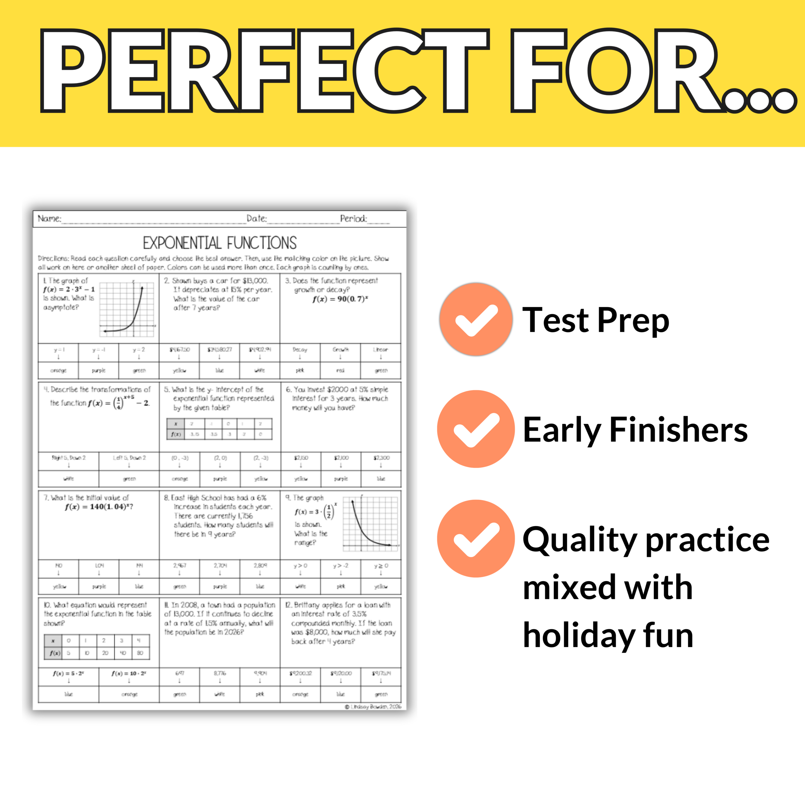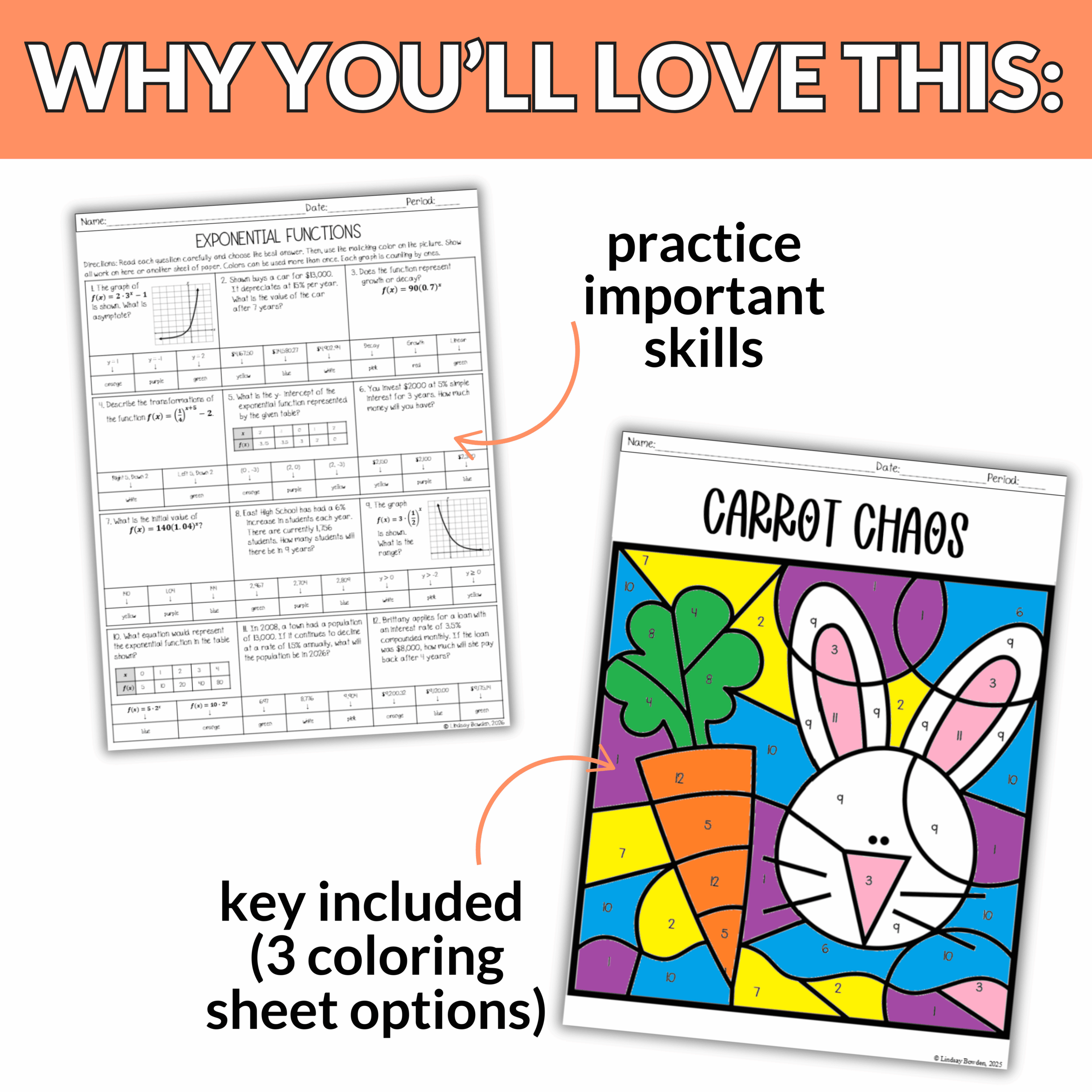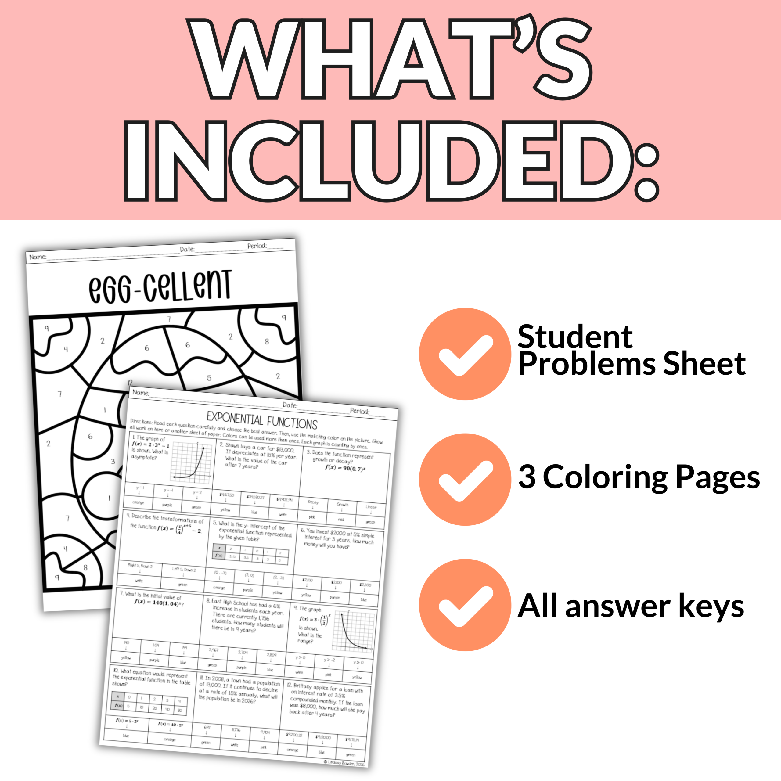 Students will determine growth vs. decay, transformations, asymptotes, interpreting graphs and tables, and real-world applications Then they will use their answers to bring an Easter picture to life. With three different picture options, your students will love comparing their finished designs without everyone doing the exact same one!