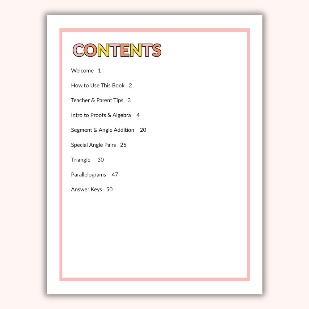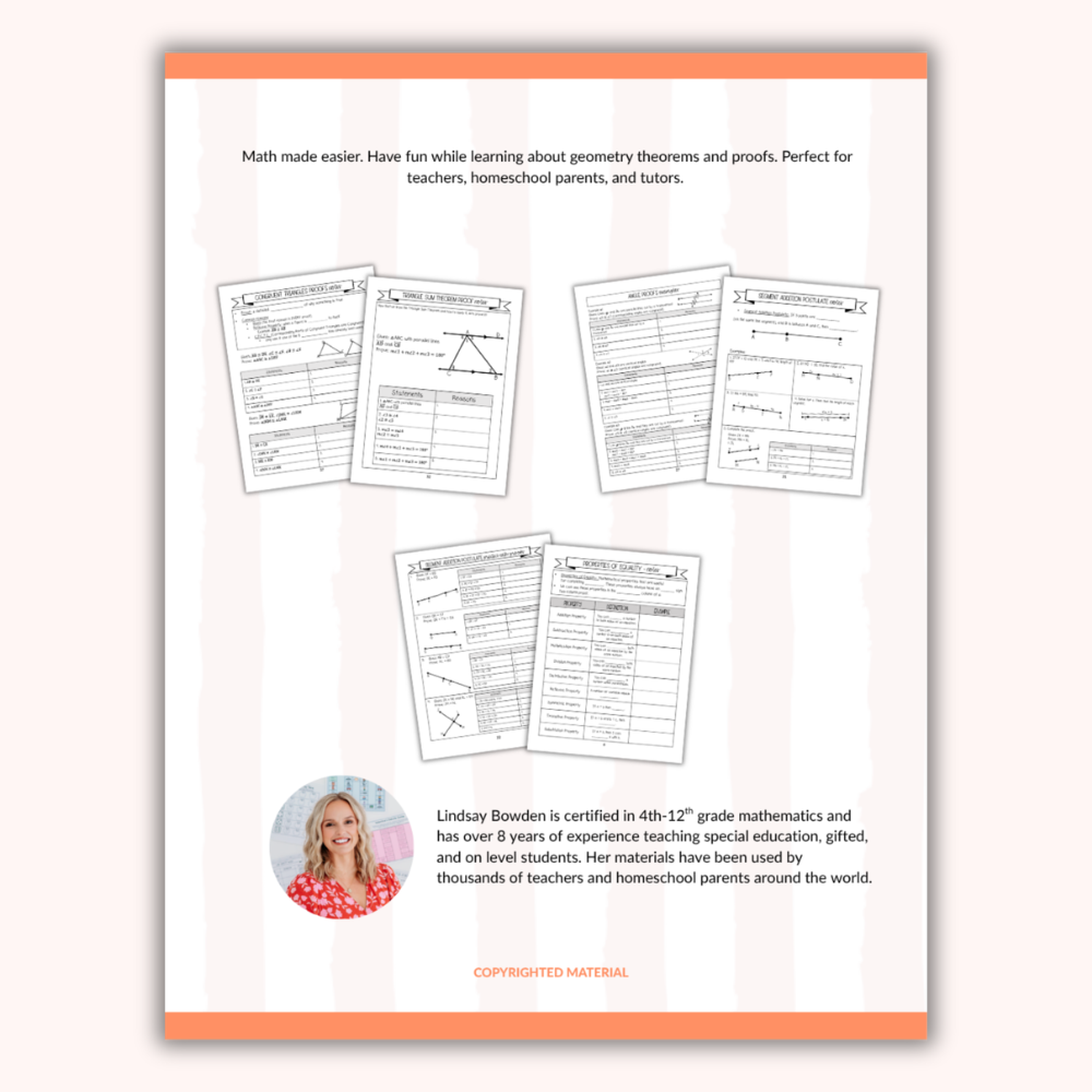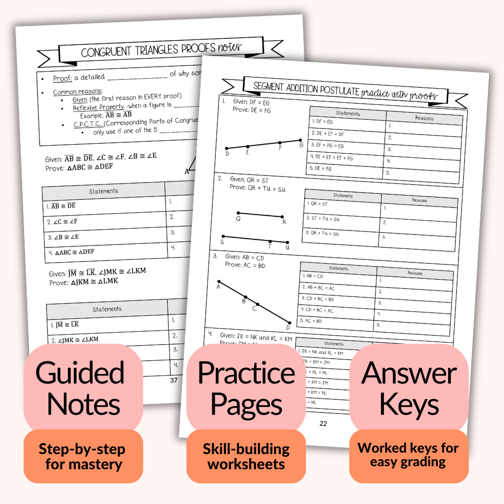 This Geometry Proofs Workbook helps students build the logical thinking skills needed to write clear and accurate mathematical proofs. Through structured lessons and guided practice, students learn how to justify statements using definitions, properties, and geometric theorems.