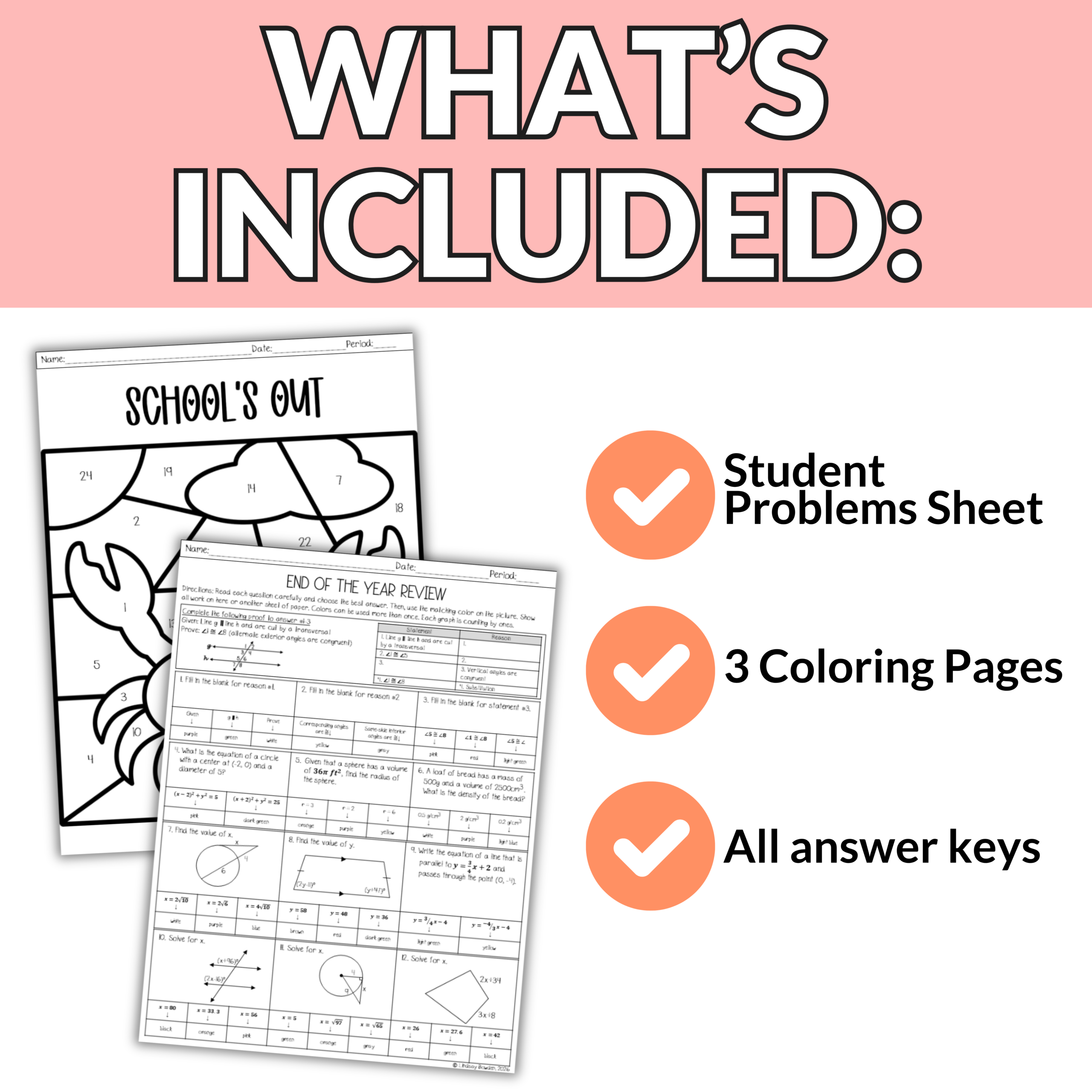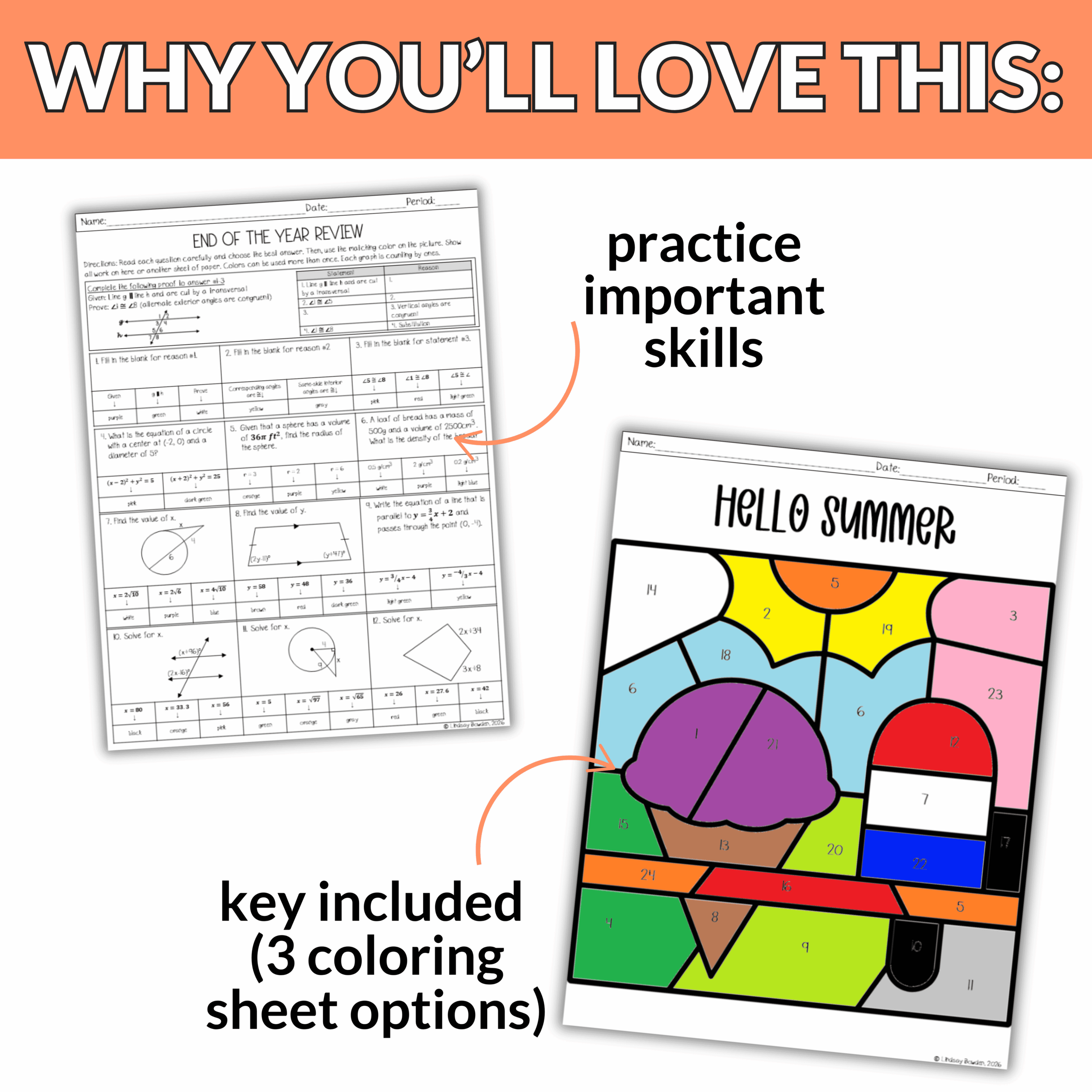 Students will review the variety of Geometry concepts from throughout the year as they solve engaging problems. Then they will use their answers to bring a Summer picture to life. With three different picture options, your students will love comparing their finished designs without everyone doing the exact same one!