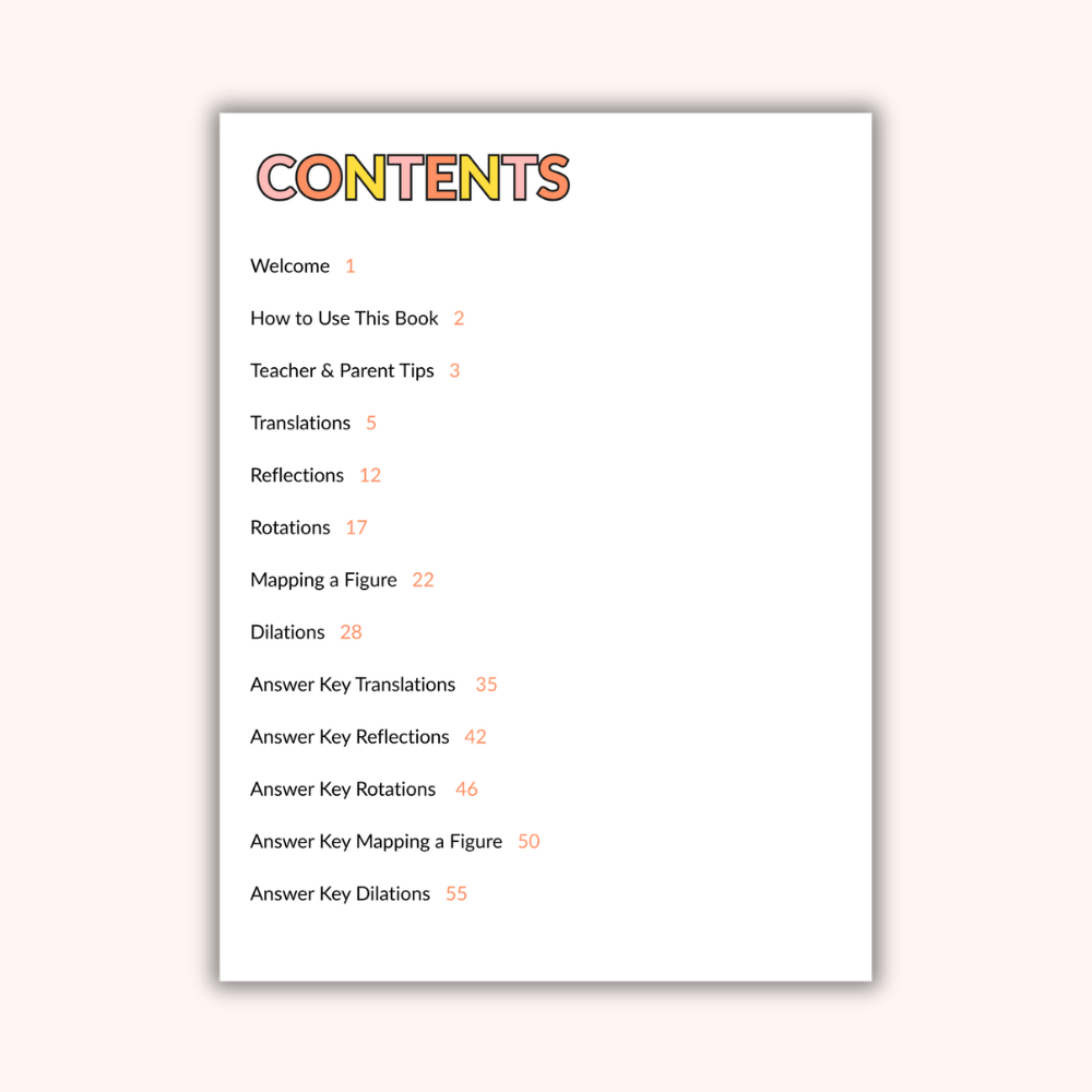 Use this workbook for daily lessons, independent practice, homework, or review. The structured layout and clear examples help students build a strong understanding of Geometry transformations and prepare for future Geometry units.