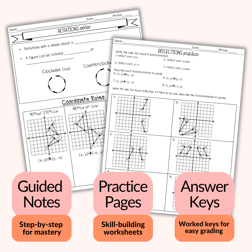 Inside this workbook, students work through guided notes, step-by-step examples, and practice problems that focus on both performing transformations and mapping a figure from a pre-image to an image. Lessons emphasize accuracy, visual reasoning, and understanding how transformations affect position, orientation, and size.