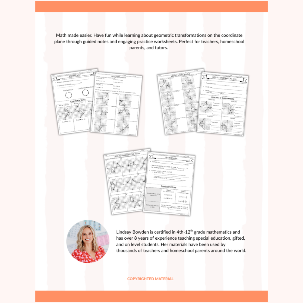 This Geometry transformations workbook helps high school students build confidence with translations, reflections, rotations, and dilations through clear instruction and targeted practice. It is designed to support students as they learn how figures move, turn, flip, and resize on the coordinate plane.