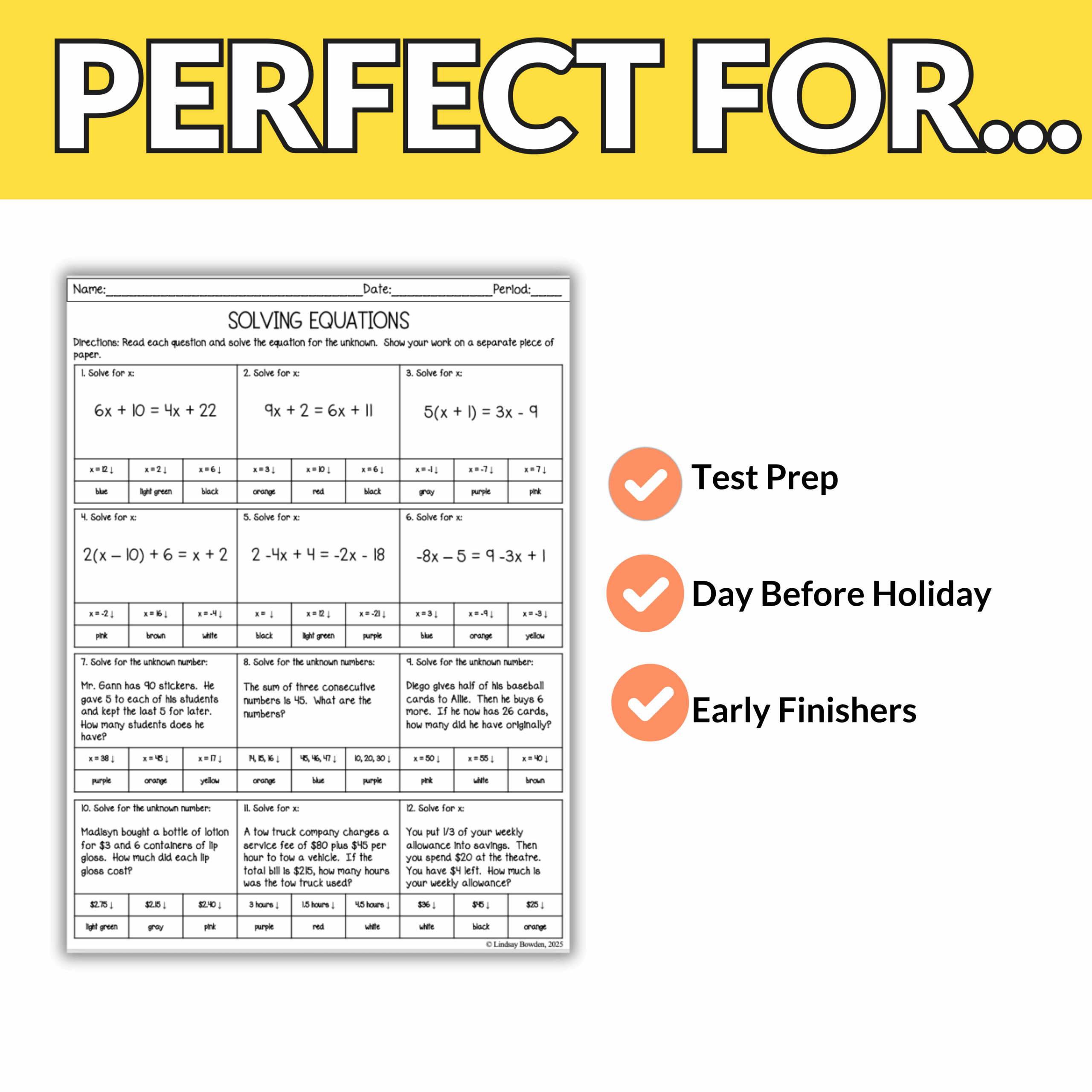 ✅ 12 Engaging Problems — a mix of standard multi-step equations and real-world word problems.