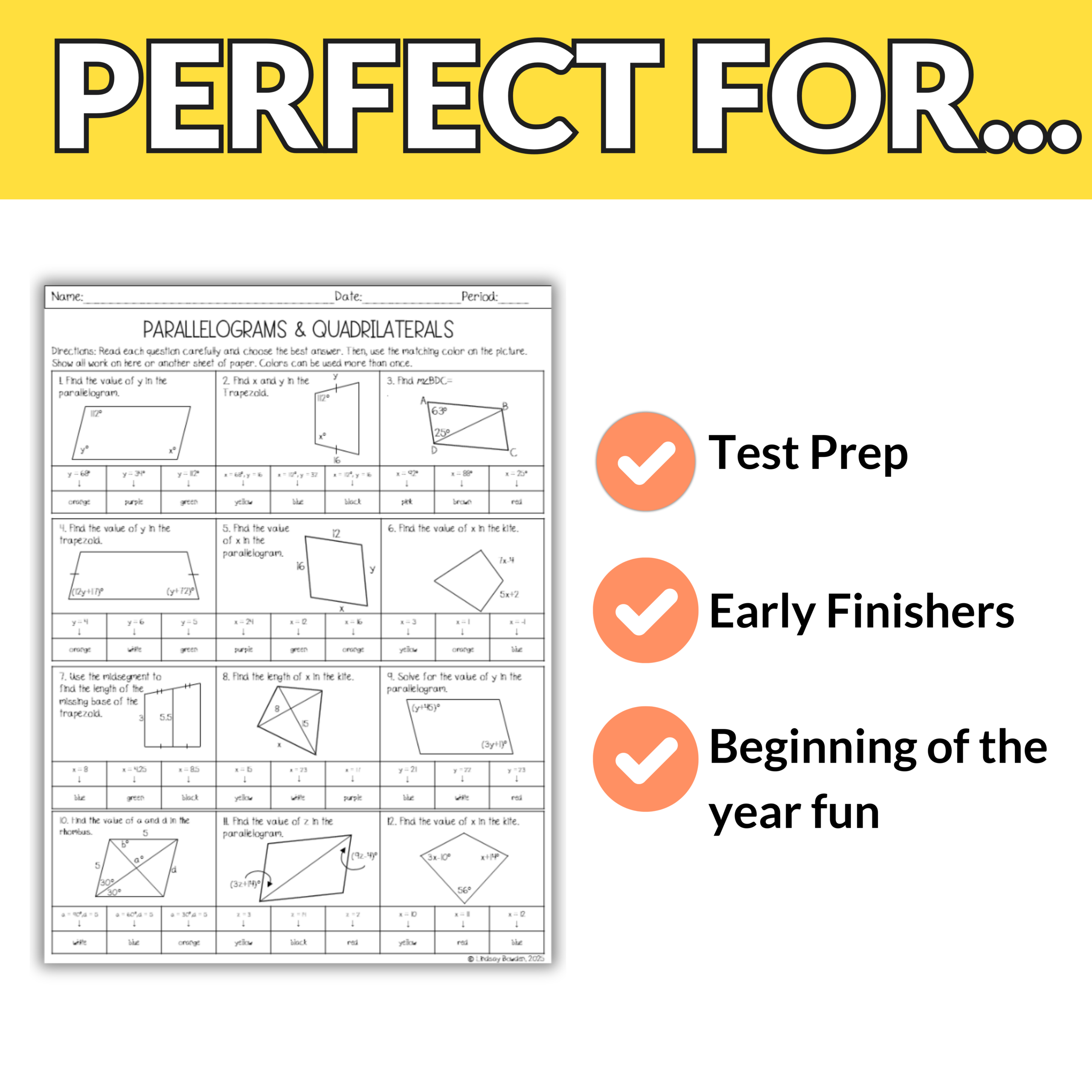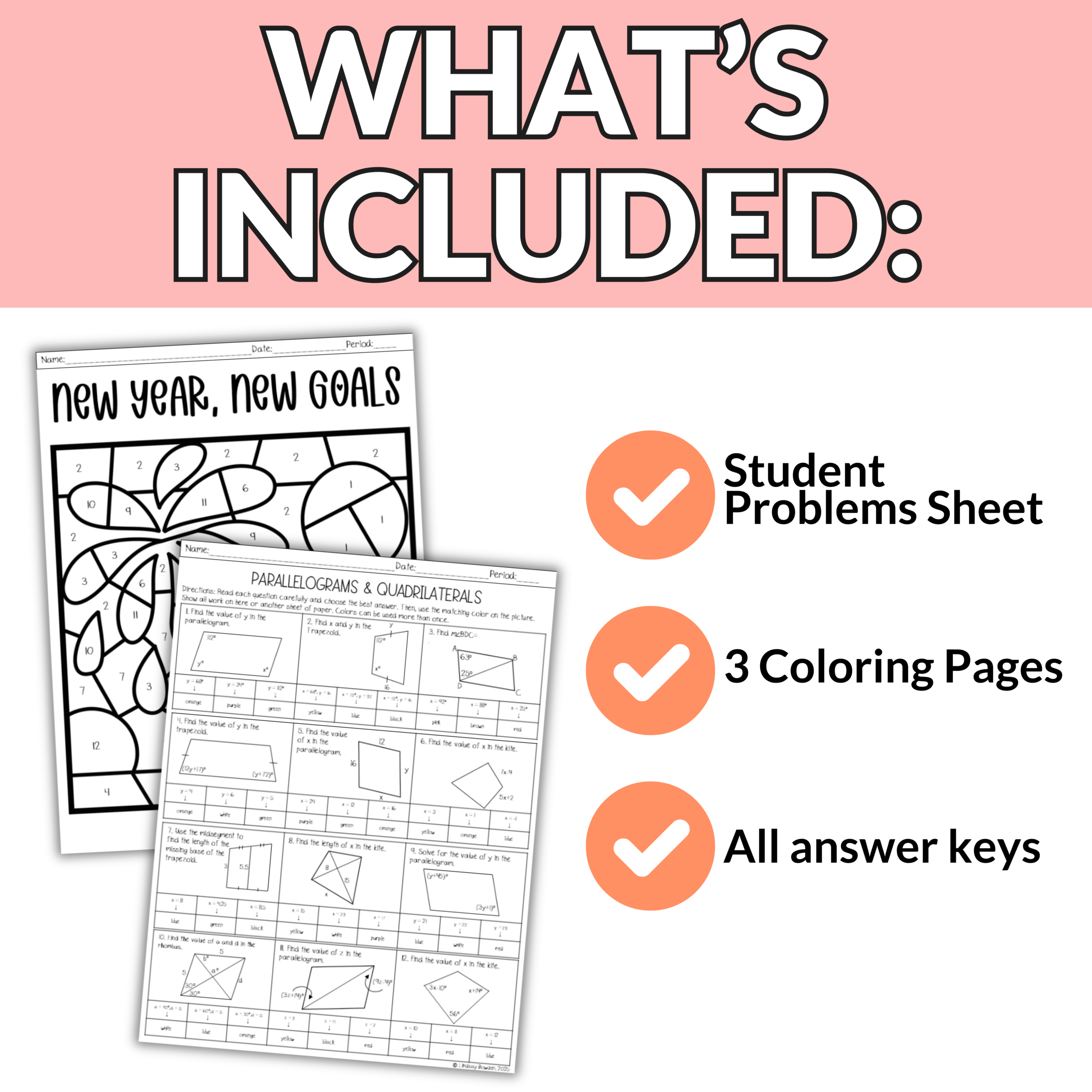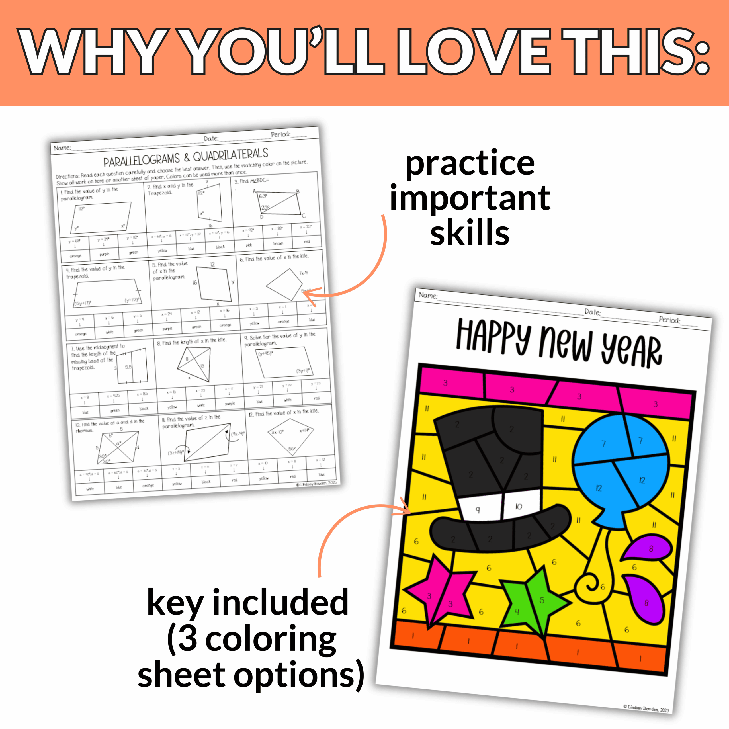 Students will work with a mix of parallelograms, trapezoids, kites, and rhombuses. Then students use their answers to bring a New Year’s picture to life. With three different picture options, your students will love comparing their finished designs without everyone doing the exact same one!